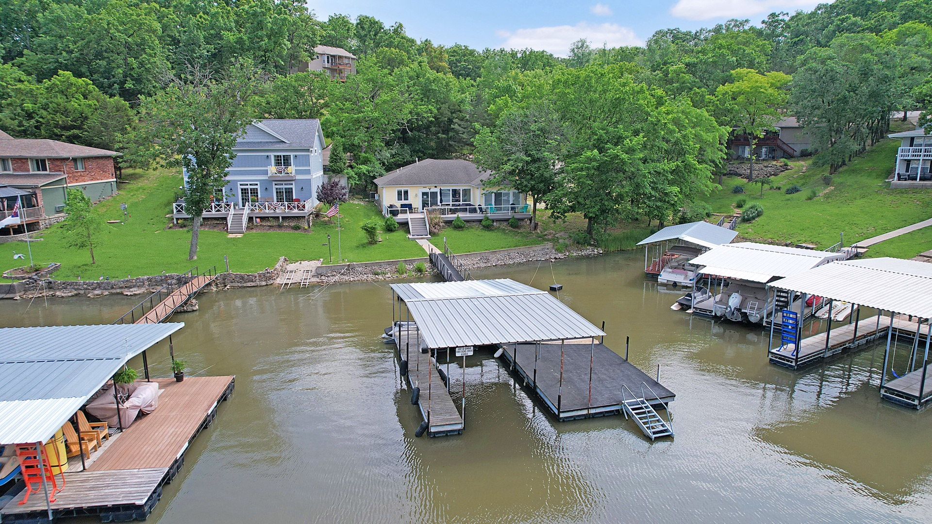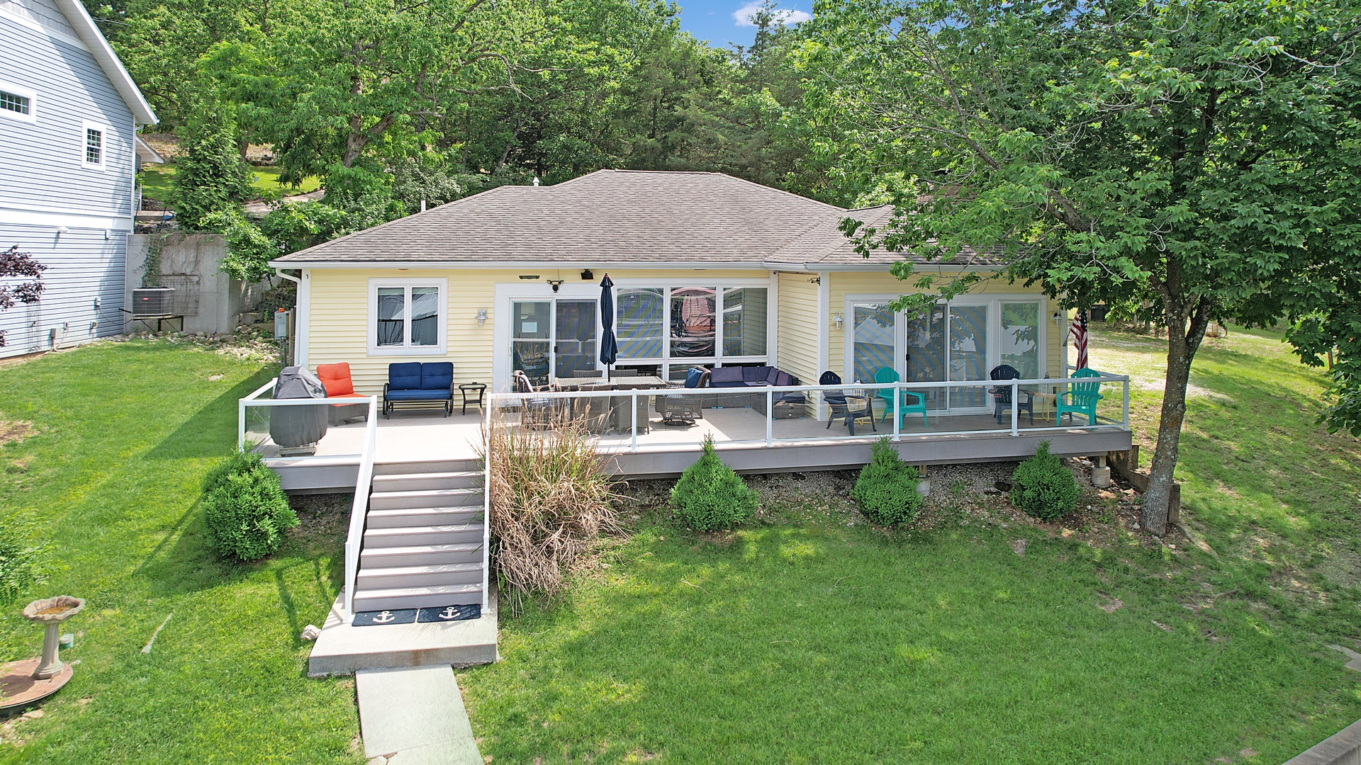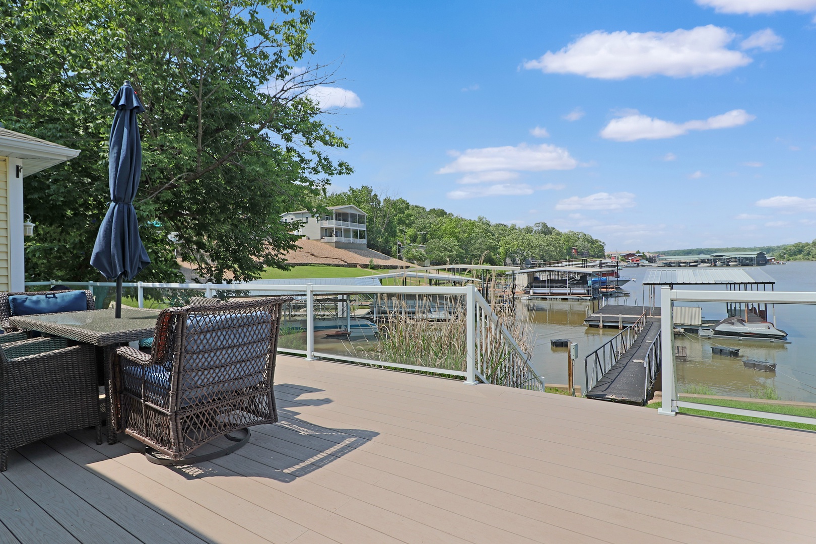 Outside, you'll find a spacious deck with plenty of seating, perfect for enjoying your morning coffee or watching the sunset over the lake. The deck also features a gas grill, making it perfect for summer barbecues. Take a dip in the waters of the lake, or bring your boat to dock at our private dock.