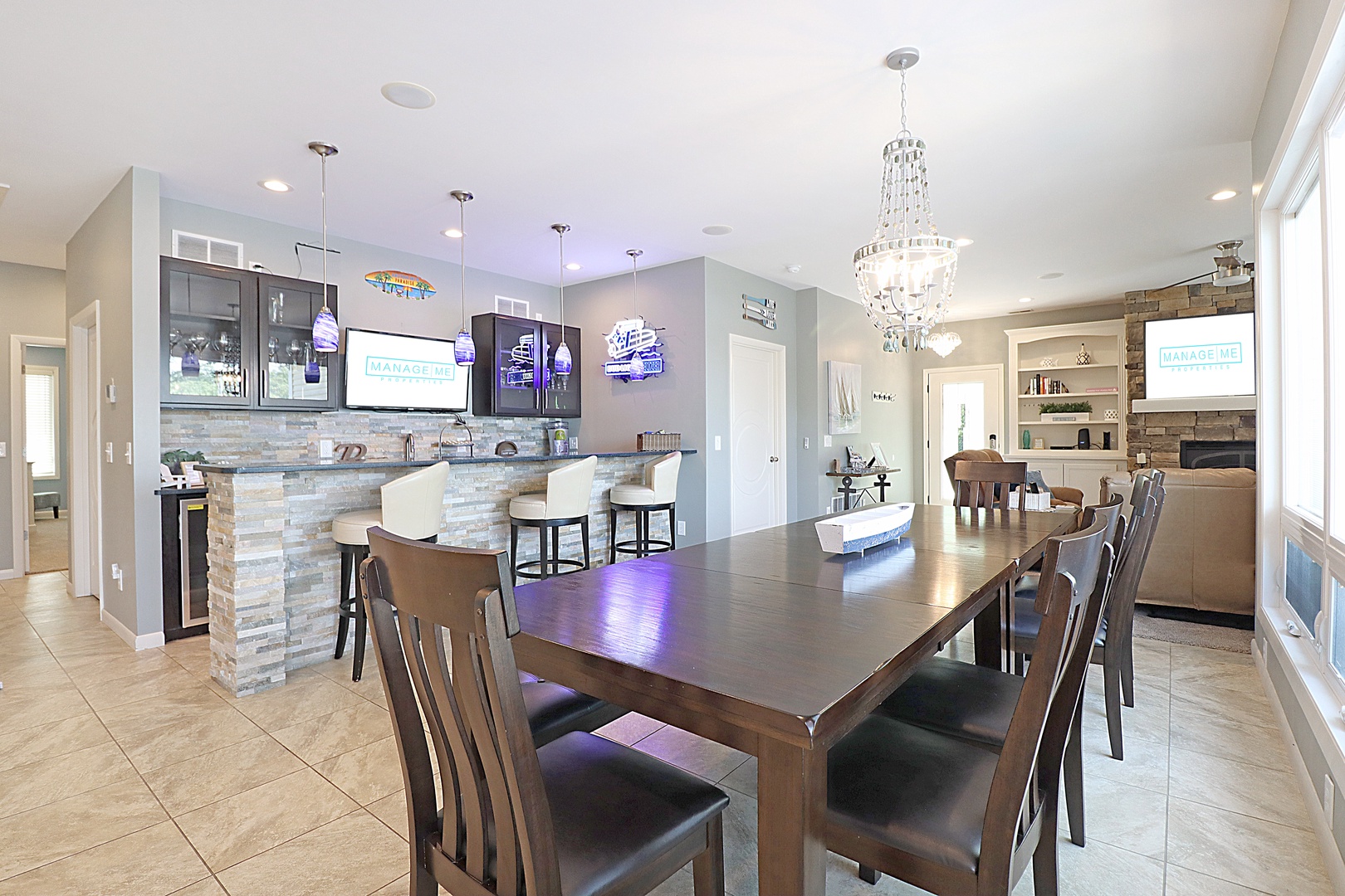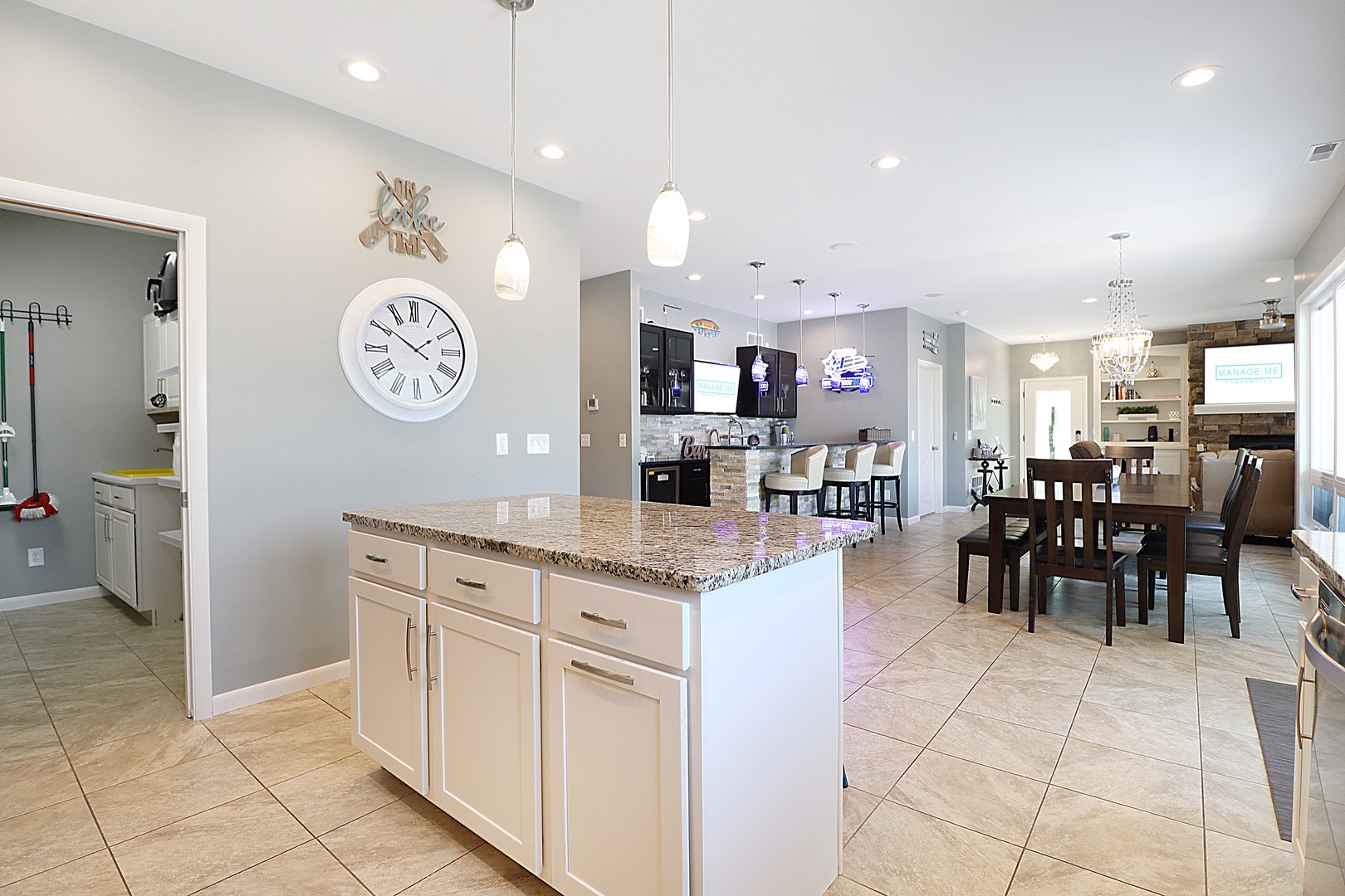 The fully equipped kitchen features granite countertops, stainless steel appliances, and everything you need to prepare delicious meals for your family and friends. The dining area is perfect for gathering around the table and enjoying a meal together.