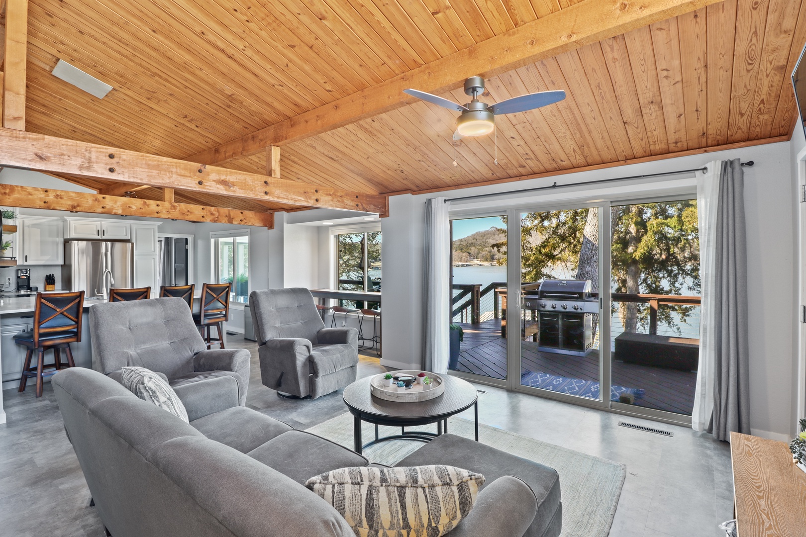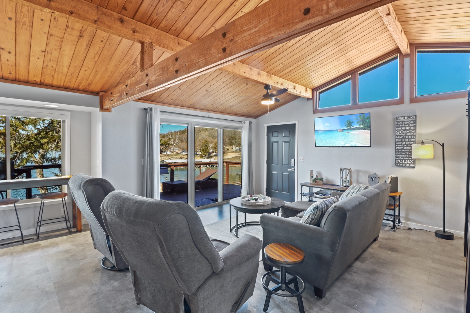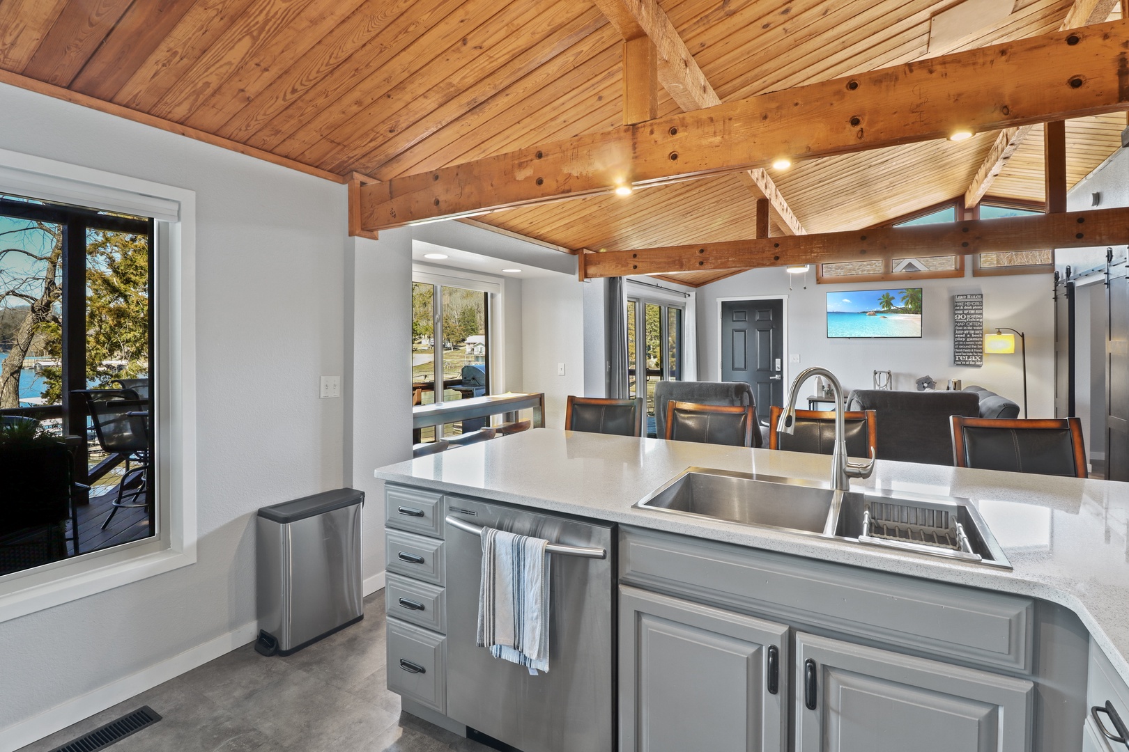 Step inside to a warm and inviting open-concept living area with large windows showcasing stunning lake views. The fully stocked kitchen has everything you need to whip up meals, and the cozy living space is perfect for unwinding after a day on the water.