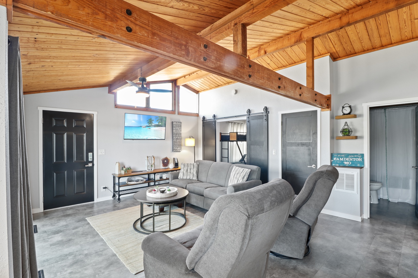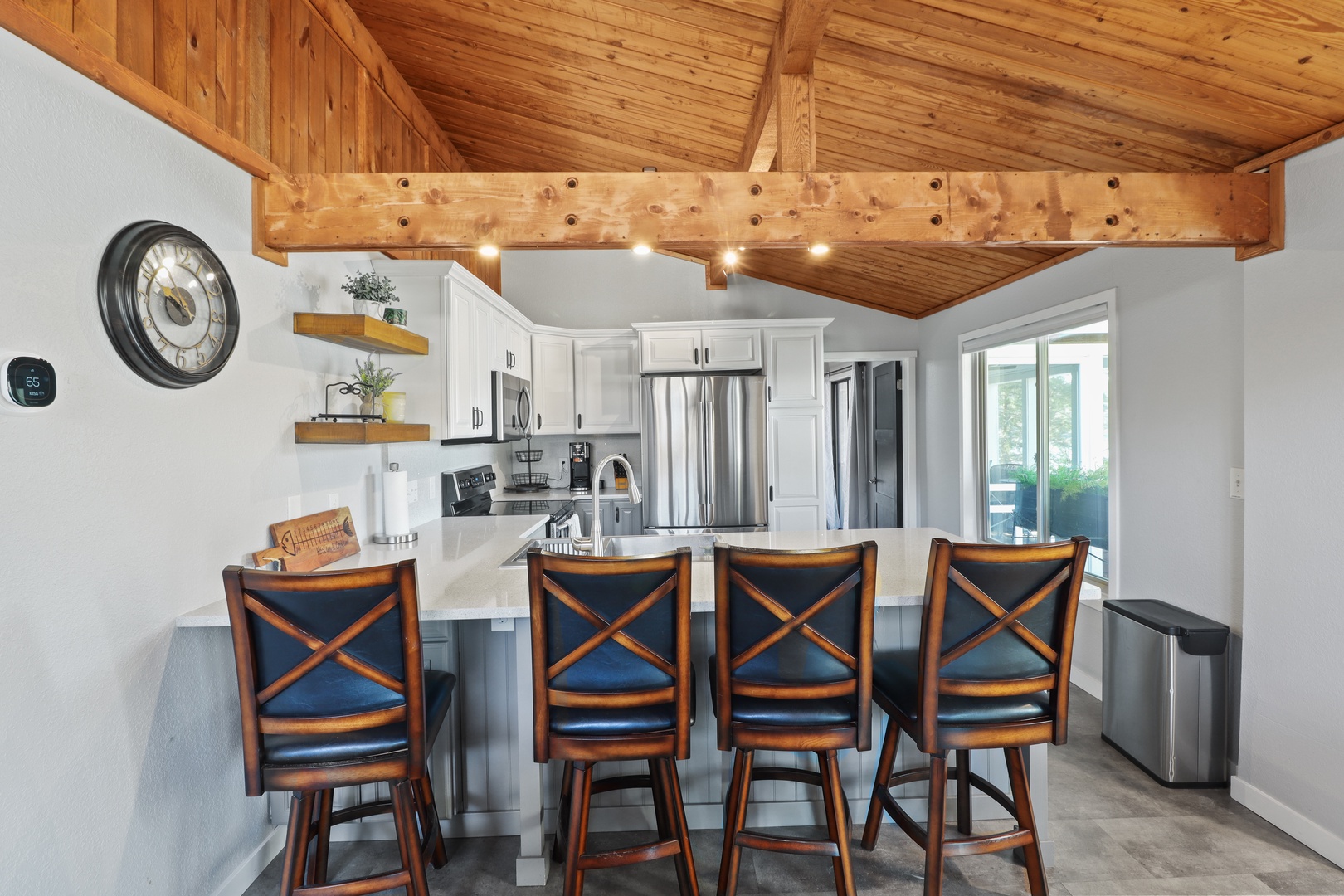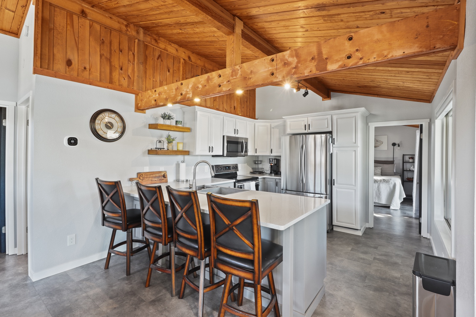 Step inside to a warm and inviting open-concept living area with large windows showcasing stunning lake views. The fully stocked kitchen has everything you need to whip up meals, and the cozy living space is perfect for unwinding after a day on the water.