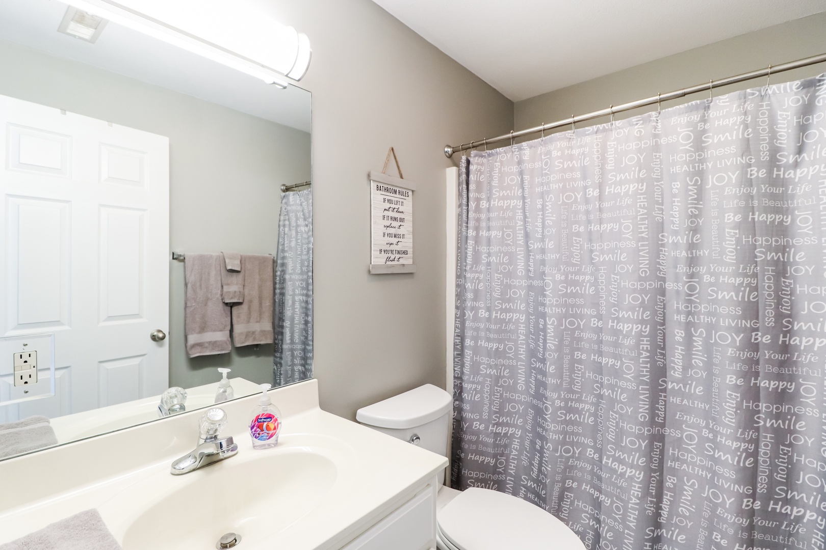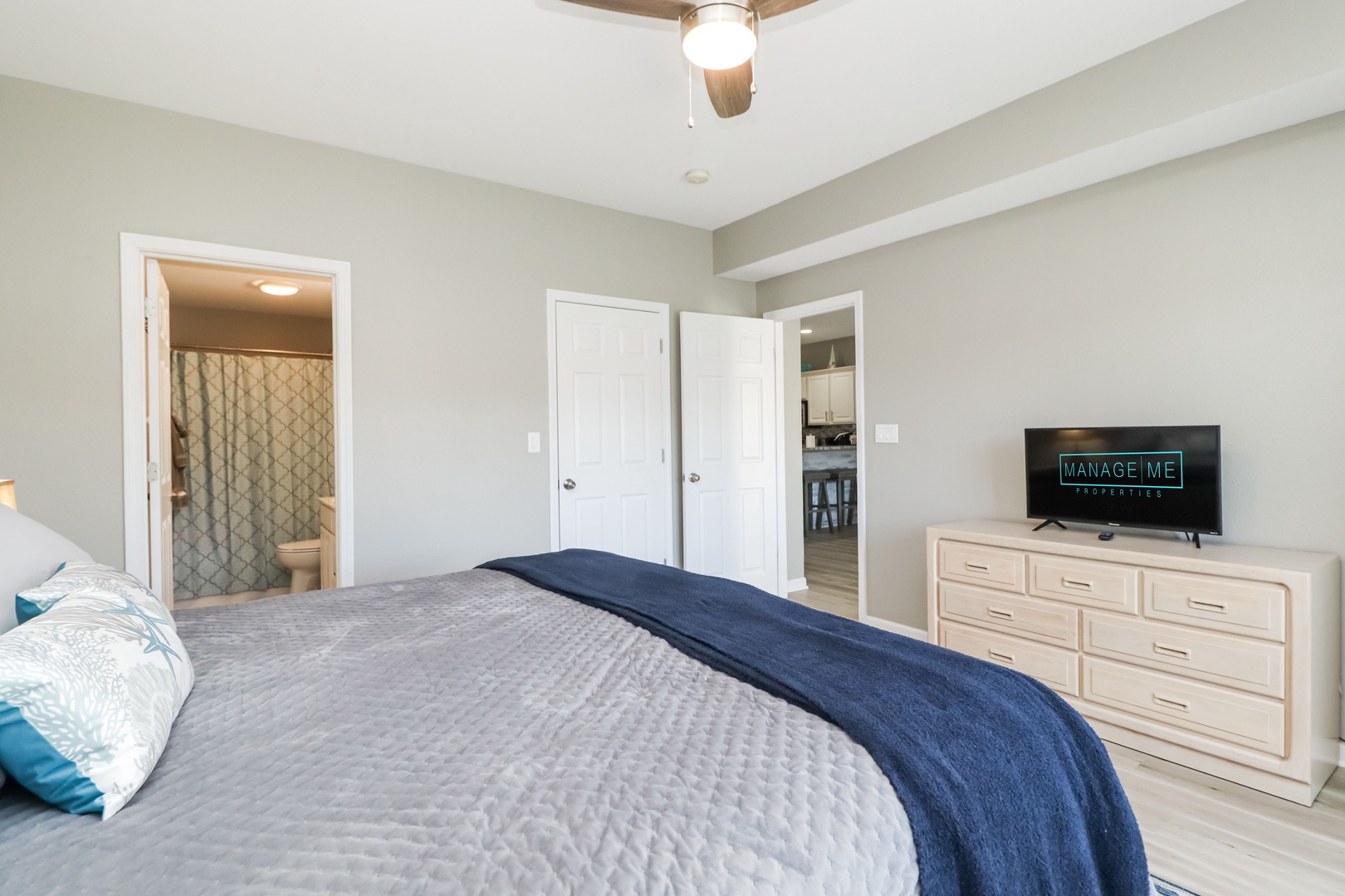 Master- King Bed with private bathroom. Double sinks in the master bath with tub shower combo