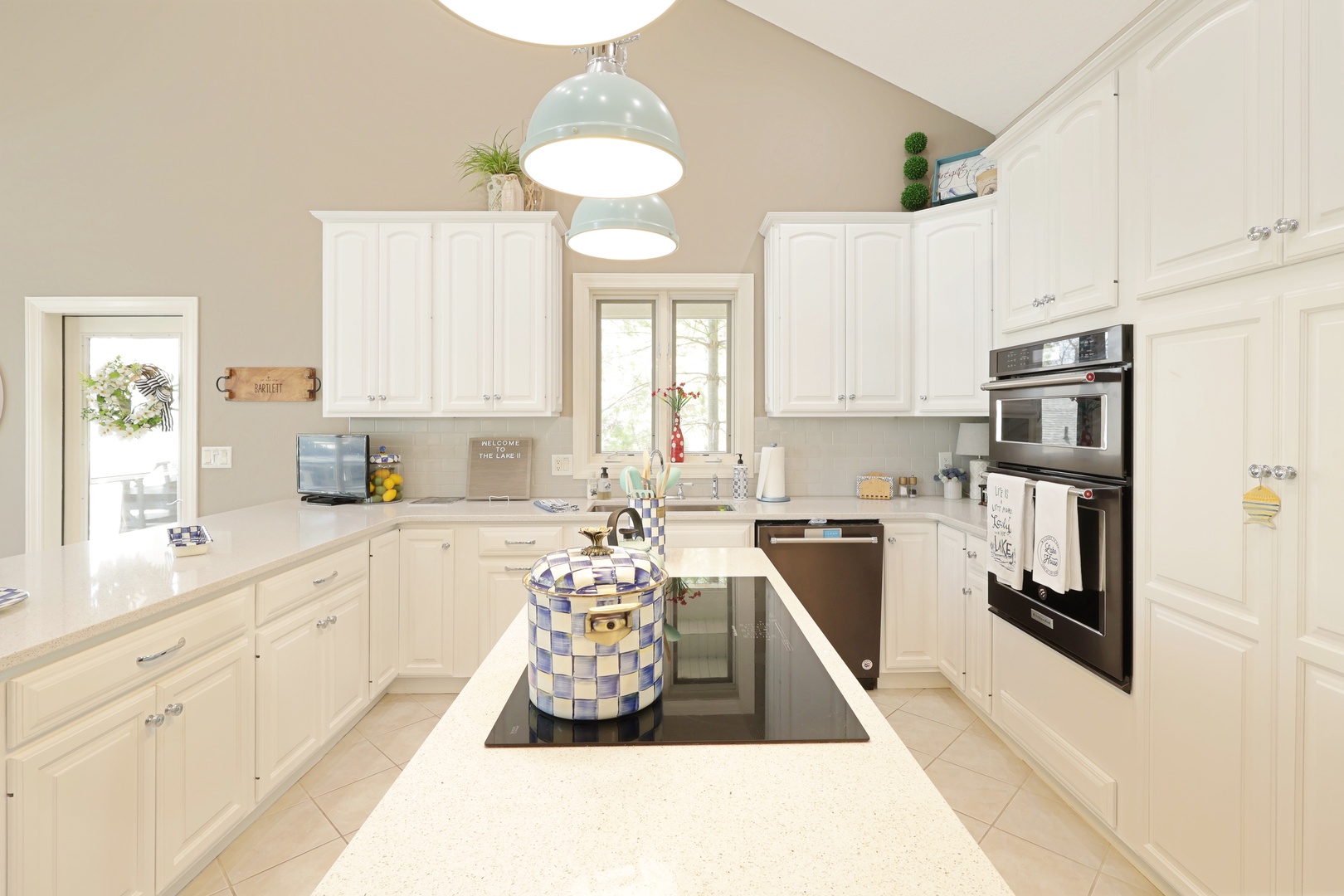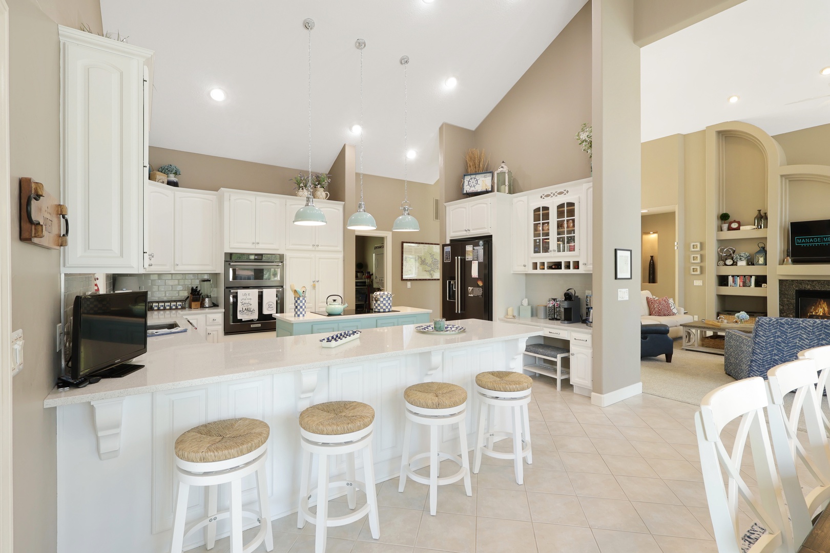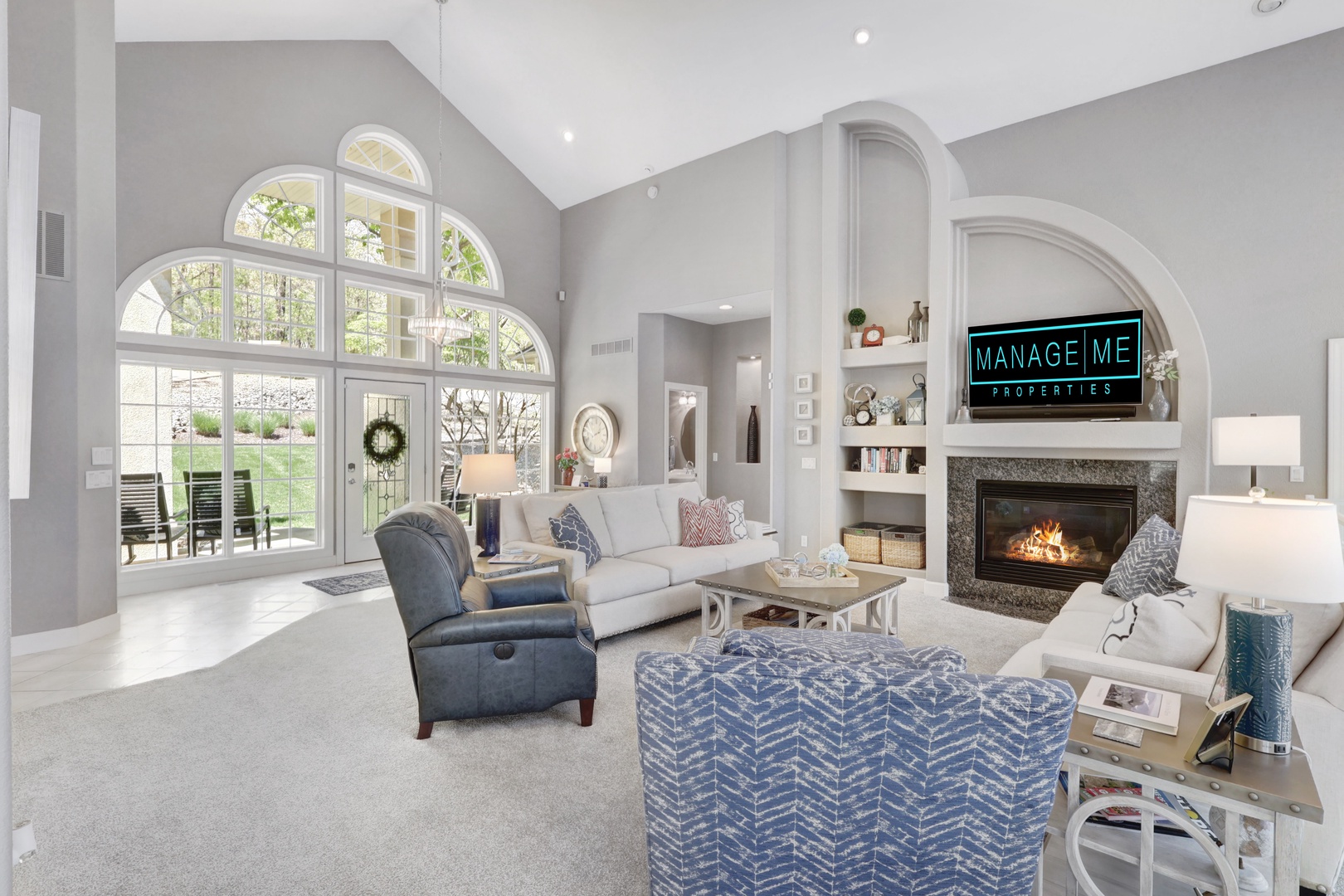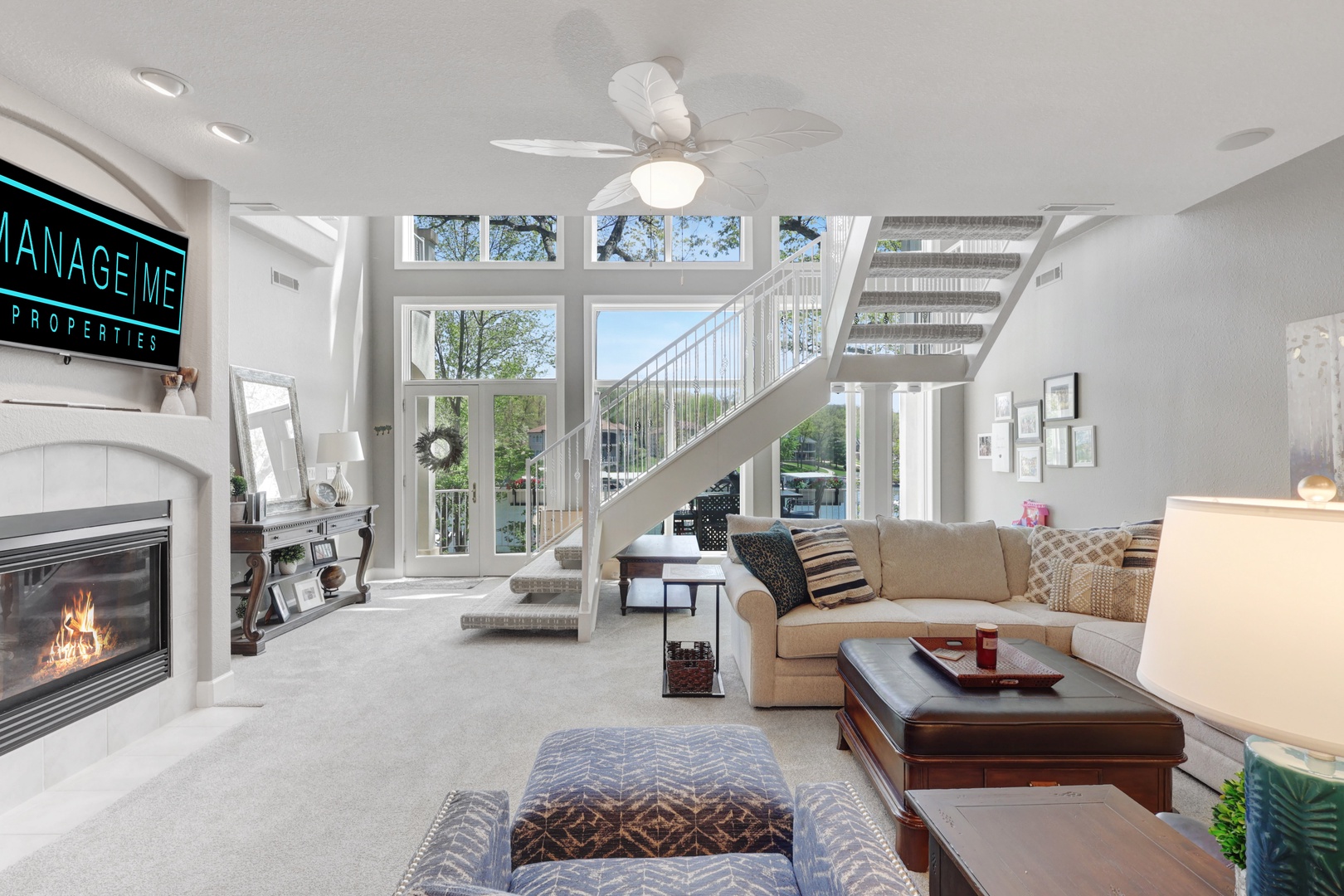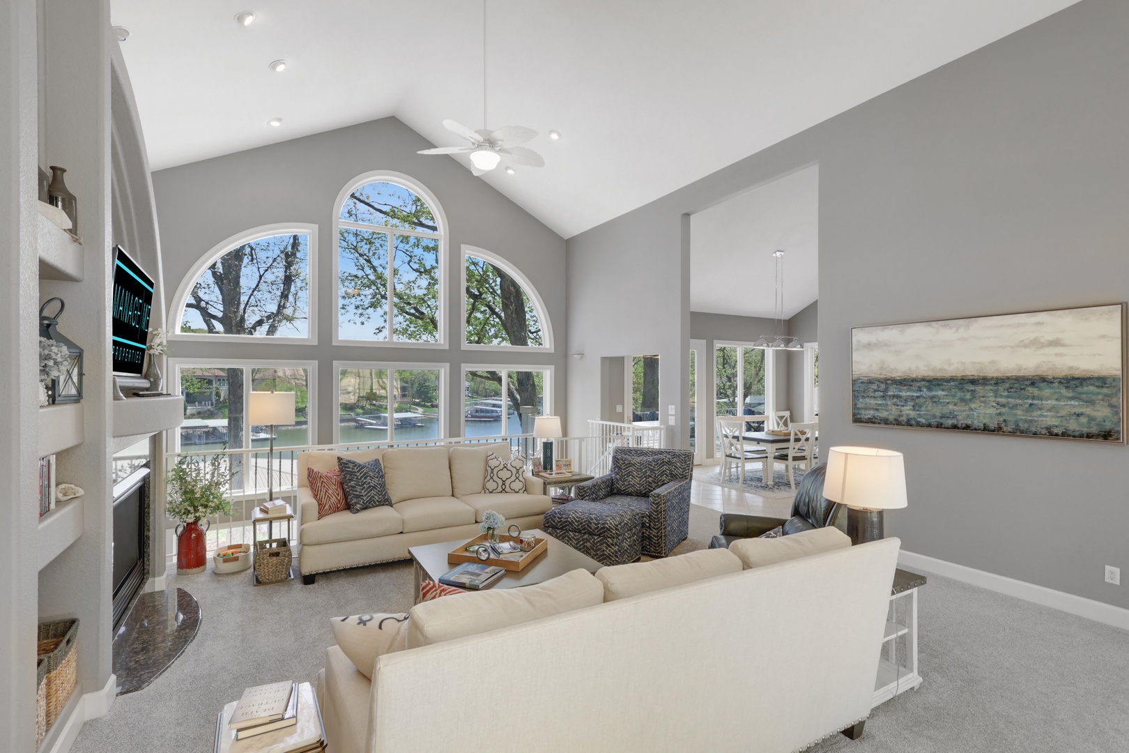 The home features a bright and open floor plan with soaring windows and abundant natural light. Step out onto the screened-in porch or expansive decks for morning coffee or evening entertainment. A lakefront gas fire pit makes it easy to relax under the stars.