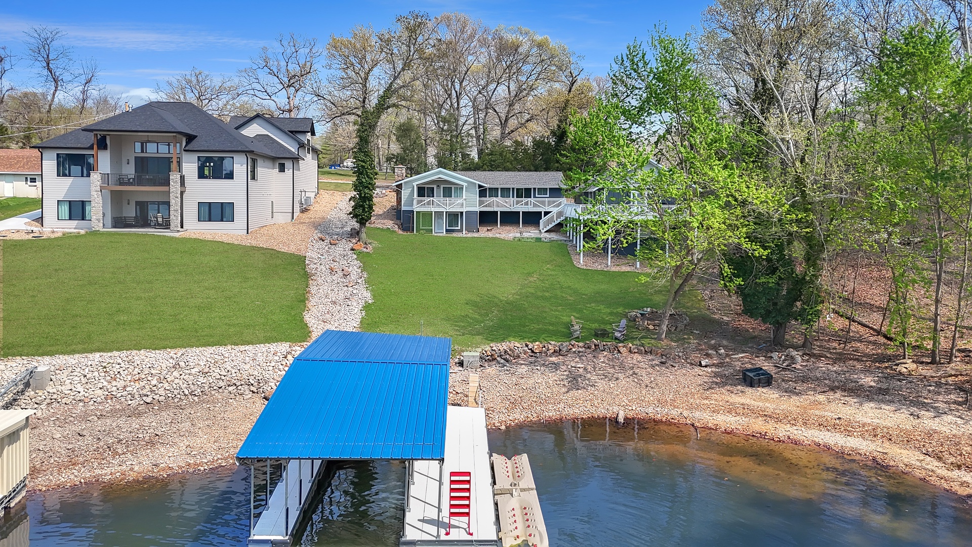 Lakefront property featuring modern home with private dock and boat house, surrounded by mature trees and manicured grounds.