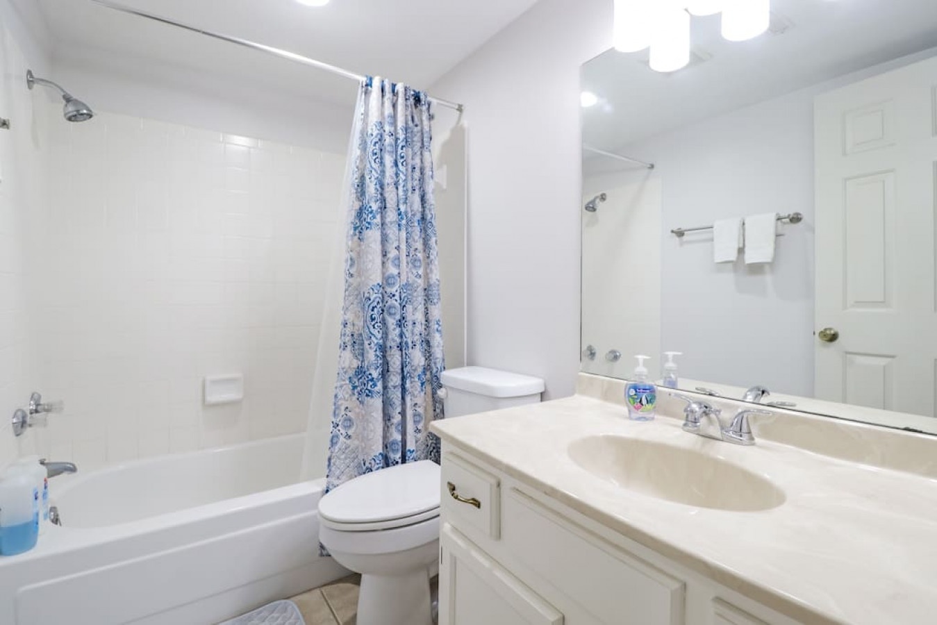 Full bathroom off guest bedroom 2. Includes 2 sinks and shower/tub combo