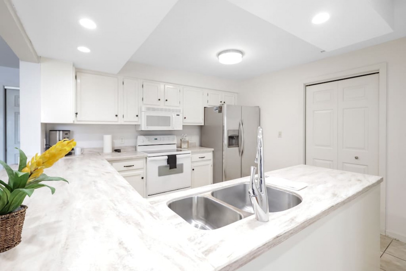 Livingroom/ Kitchen- Updated kitchen in 2021. All utensils, plates, cups, etc are supplies. Livingroom has a 32-inch TV. Large dining table for 8 guests.