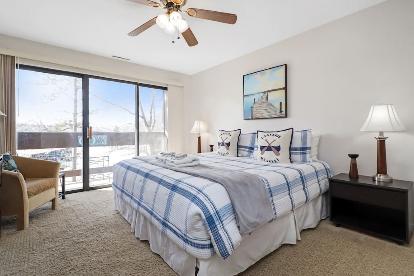 Master Bedroom- King bed with Private attached bathroom. Tub/ shower combo. Private patio overlooking the lake.