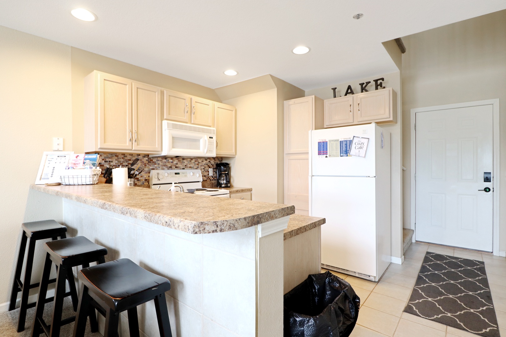 As soon as you step inside, you'll be greeted by an open concept living area with vaulted ceilings and large windows that let in plenty of natural light. The fully equipped kitchen is perfect for preparing your favorite meals.
