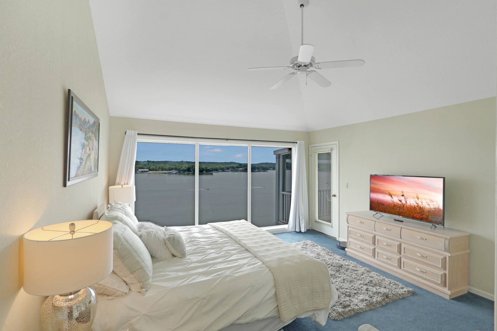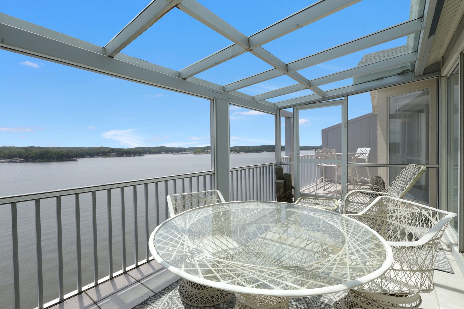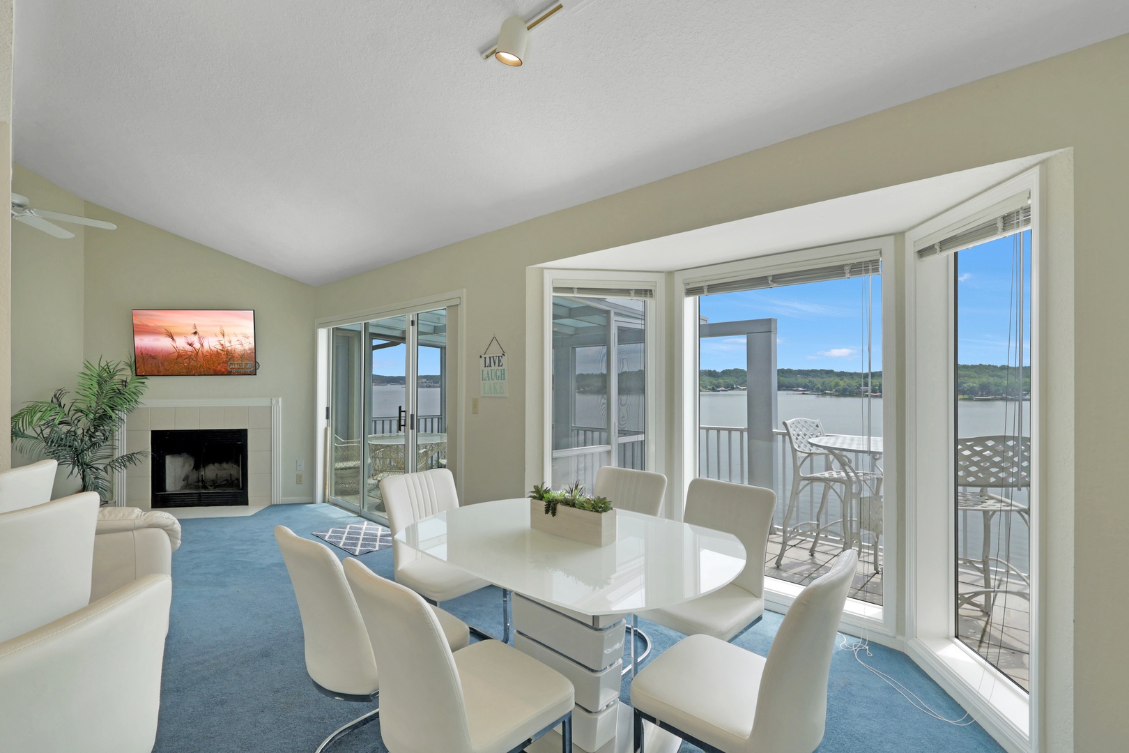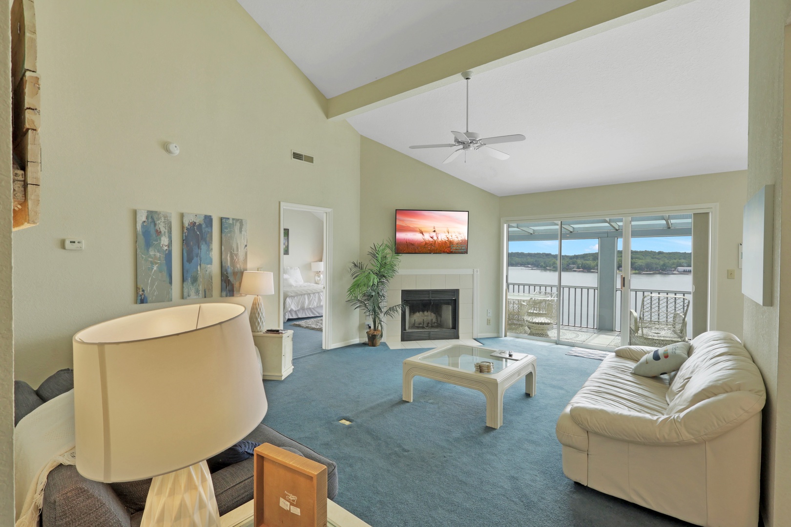 The open-concept living area leads to a private deck with a charcoal grill—ideal for taking in lake views with your morning coffee or evening dinner.