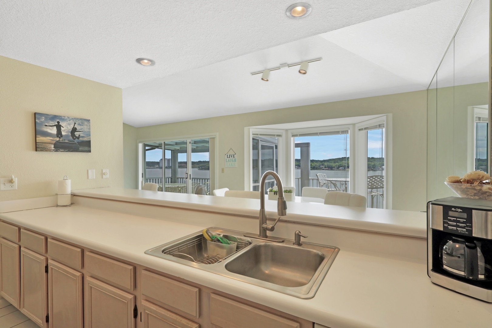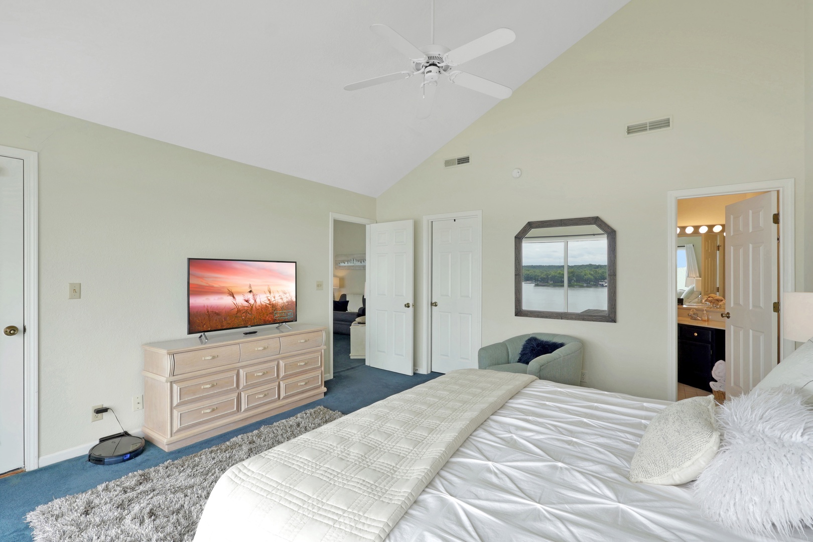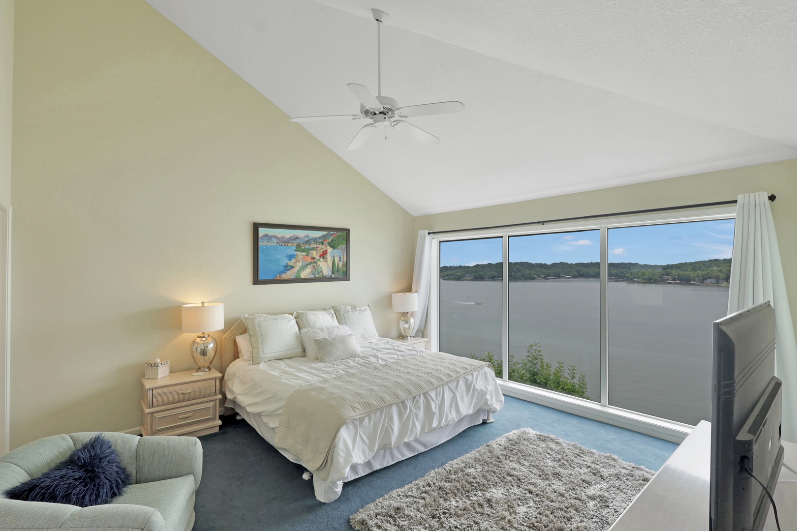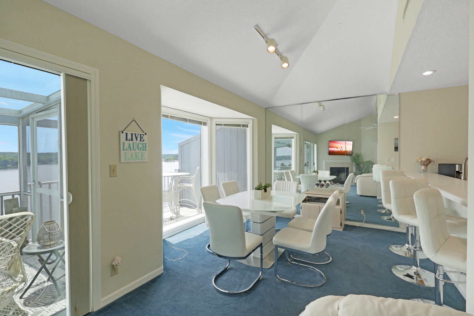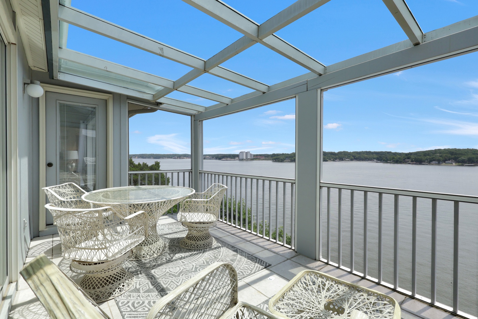 The open-concept living area leads to a private deck with a charcoal grill—ideal for taking in lake views with your morning coffee or evening dinner.