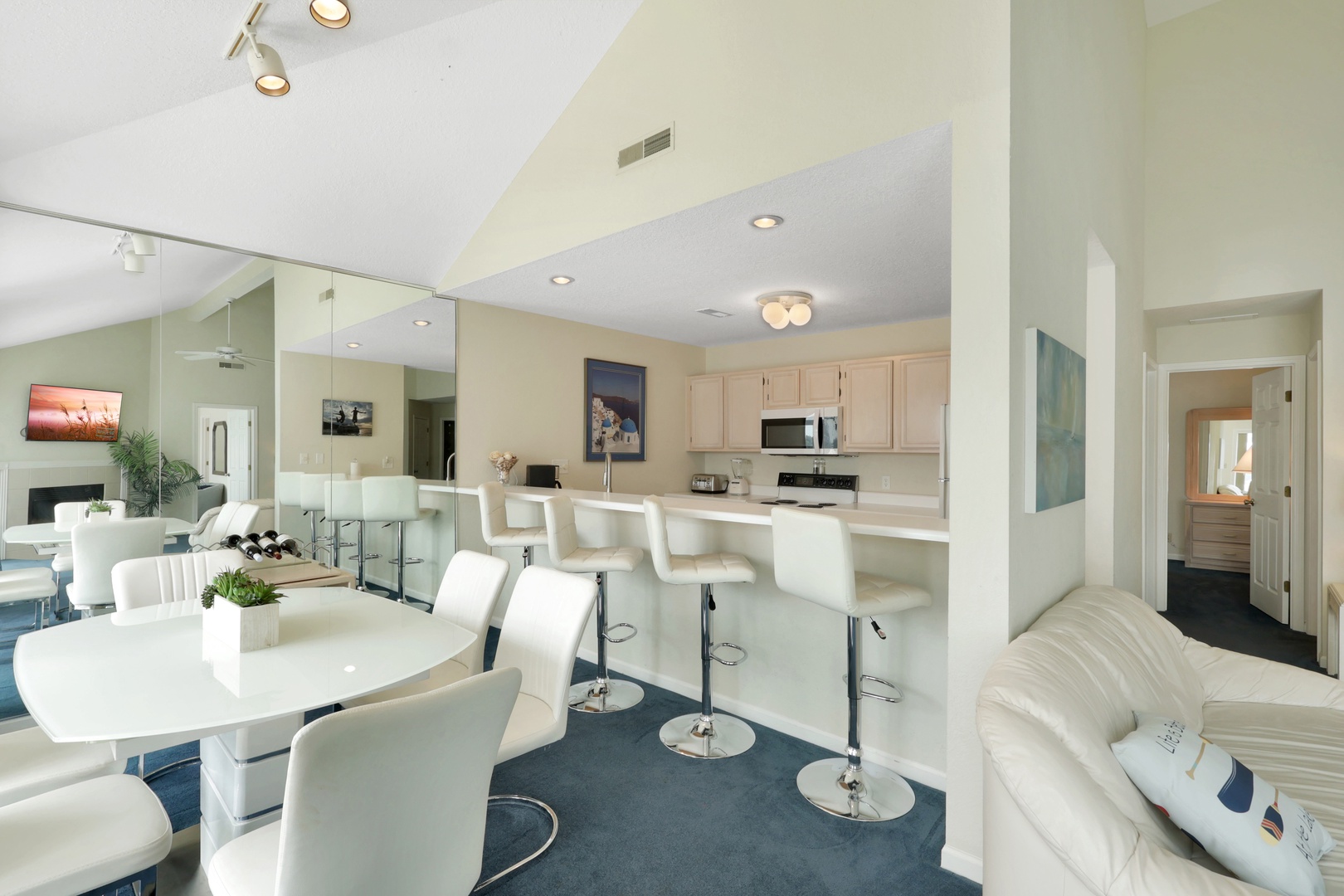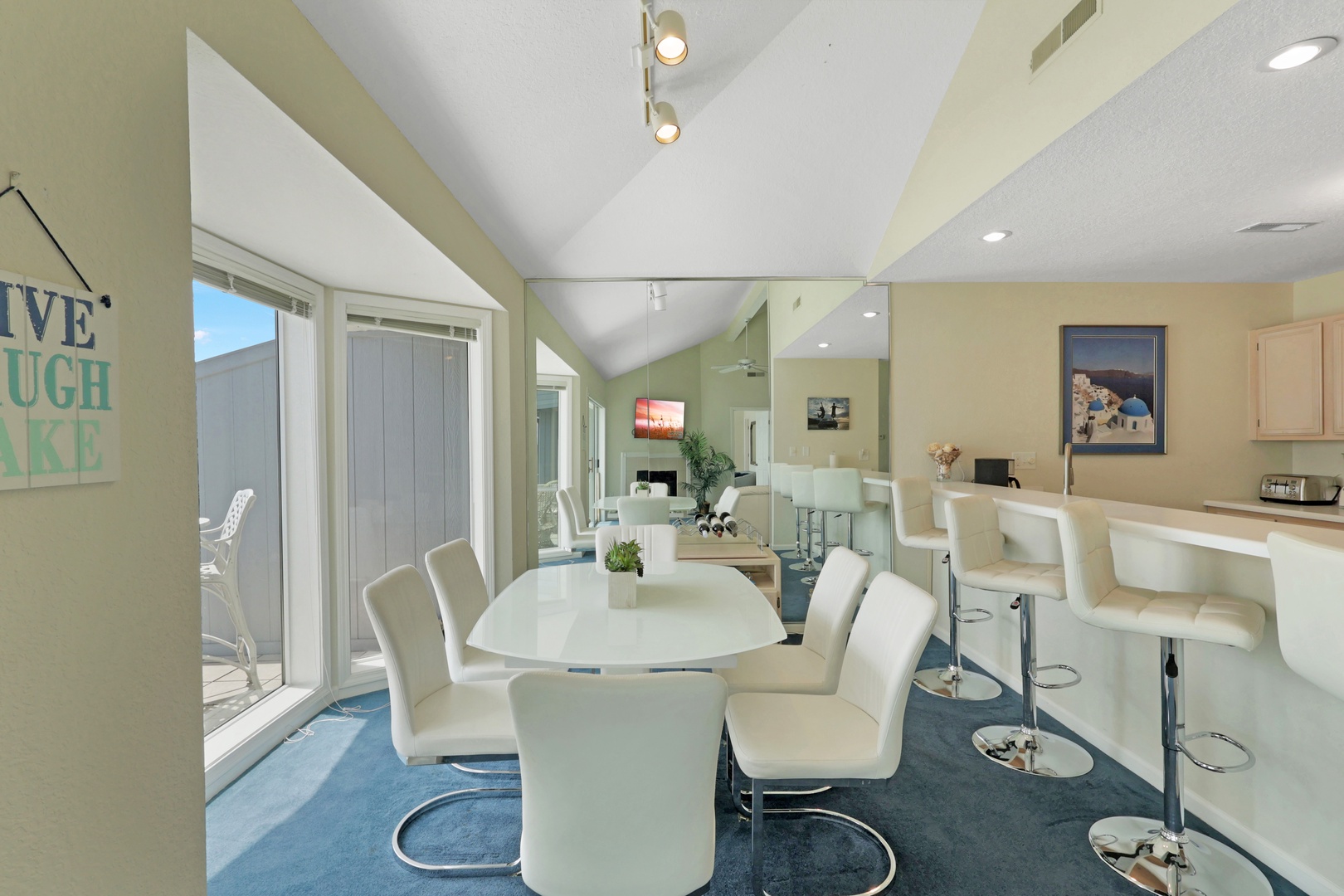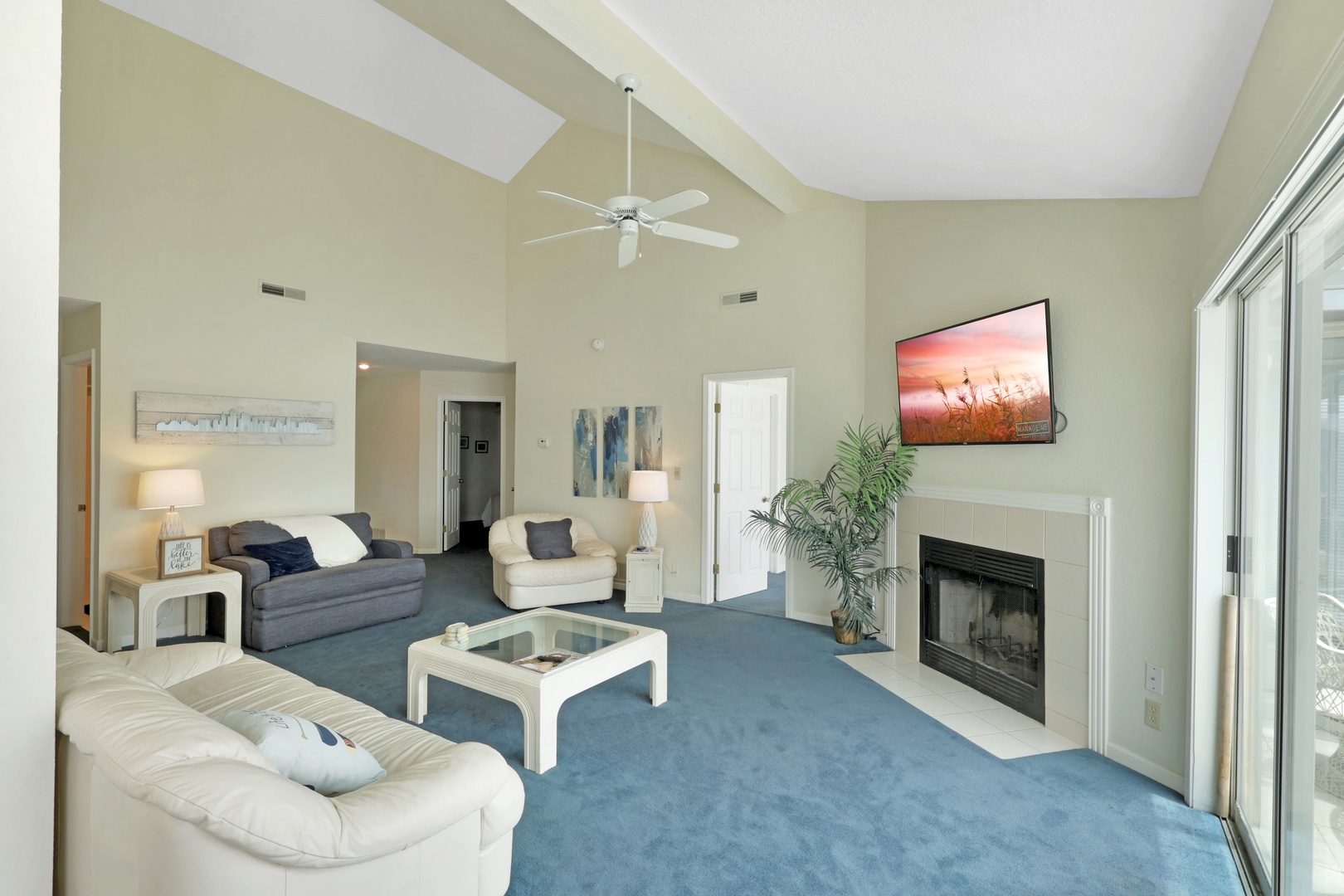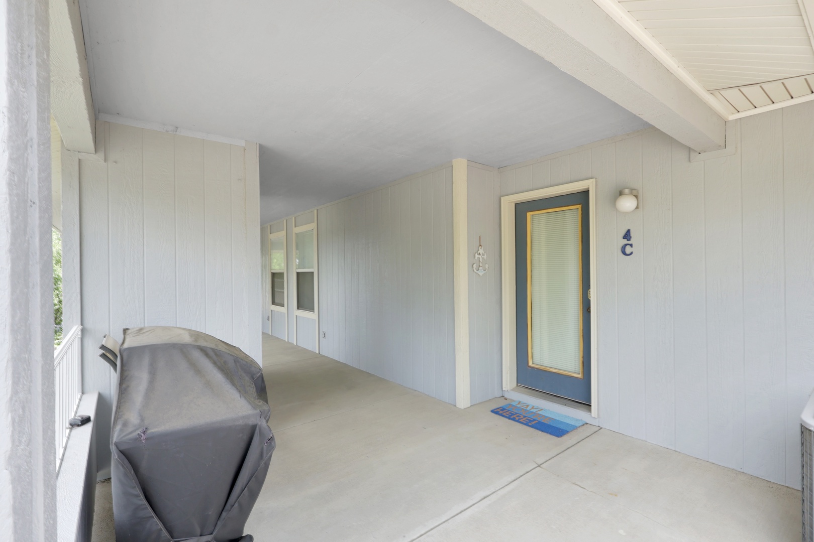 The open-concept living area leads to a private deck with a charcoal grill—ideal for taking in lake views with your morning coffee or evening dinner.